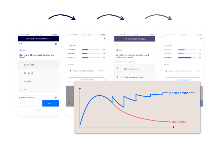 Reinforce learning concepts at structured intervals and help your learners beat the forgetting curve. With the MemoTrainer, send reminders to learners to check in and complete the selection of questions laid out for them!